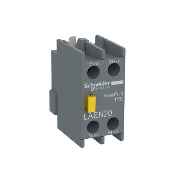 Bloco de contato auxiliar adicional para contatores EasyPact TVS LC1E. Fornece contatos instantâneos 2NA classificados até 10A 690V CA, conectados por terminais de grampos de parafuso. Ele pode ser usado em aplicações de segurança graças aos seus contatos espelhados com certificação NC. Fácil de montar na frente por clip-on, proporciona alta confiabilidade e durabilidade. Disponível em todo o mundo, é certificado por vários padrões (IEC, UL, CSA, CCC, EAC, Marine) e compatível com Green Premium (RoHs/Reach).
