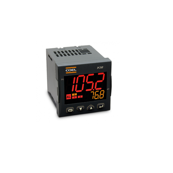 KM1B é um controlador de temperatura da família Kube com configuração fácil. Possui entrada configurável para termopares tipo J, K, S, R, T ou termoresistência Pt100.