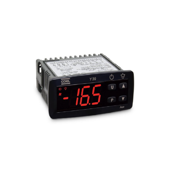 O modelo Y39 é um controlador eletrônico digital microprocessado desenvolvido para aplicações em refrigeração com controle de temperatura ON/OFF e controle de degelo por intervalo de tempos mediante parada do compressor, aquecimento elétrico ou gás quente com inversão de ciclo. O instrumento possui até 3 saídas a relé e 3 entradas para sondas NTC ou PTC, com a possibilidade de 1 entrada ser configurada como entrada digital. Também pode ser equipado com um buzzer para sinalização de alarme sonoro. As 3 saídas são utilizadas para comando do compressor (ot), degelo (dF) e ventilador (Fn), sendo que qualquer uma das saídas acima tem a possibilidade de ser configurada como saída auxiliar (Au) ou alarme. As 3 entradas para sondas de temperatura são utilizadas para controle da temperatura ambiente, para monitorar a temperatura do evadorador e para medir uma temperatura auxiliar (exemplo: temperatura do produto). A entrada da sonda para evaporador ou a entrada da sonda auxiliar pode ser configurada como entrada digital e executar algumas funções como: sinalização de porta aberta, comando de degelo, seleção do Set Point de controle, sinalização de alarme externo, ativação do ciclo continuo, ativação da saída auxiliar, etc.