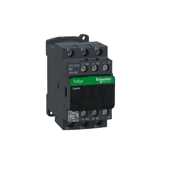 Contator TeSys Deca, 3 polos (3NA), para aplicações de controle de motores até 12A/690V AC-3/3e (5,5kW@400V). Fornece uma bobina de 24 Vcc com módulo supressor de transientes, contatos auxiliares embutidos 1NA+1NF (certificado espelho NF), conexão por terminais de grampo de parafuso. Para taxas de operação de até 3600 ciclos/hora e ambientes de até 60°C, adquire alta confiabilidade e durabilidade. Compacto (largura de 45 mm), montagem em trilho DIN ou fixação por parafuso. Certificação multipadrões (IEC, UL, CSA, CCC, EAC, Marine), compatível com Green Premium (RoHS/REACh).