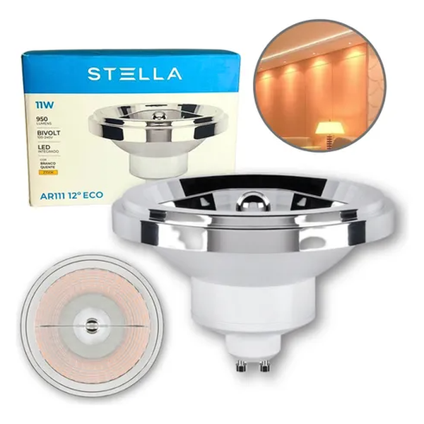 A Lâmpada Stella AR111 Eco de 11 W entrega até 950 lm com luz quente de 2700 K, ideal para iluminação de destaque em ambientes residenciais ou comerciais. Com base GU10 e facho de 24°, proporciona precisão e conforto visual. Feita para durar 25.000 horas (L70), possui excelente eficiência luminosa (~86 lm/W) e índice de reprodução de cor superior (IRC ≥ 80). Bivolt automático, performance estável e garantia de 2 anos. A escolha eficiente e elegante da linha Eco.