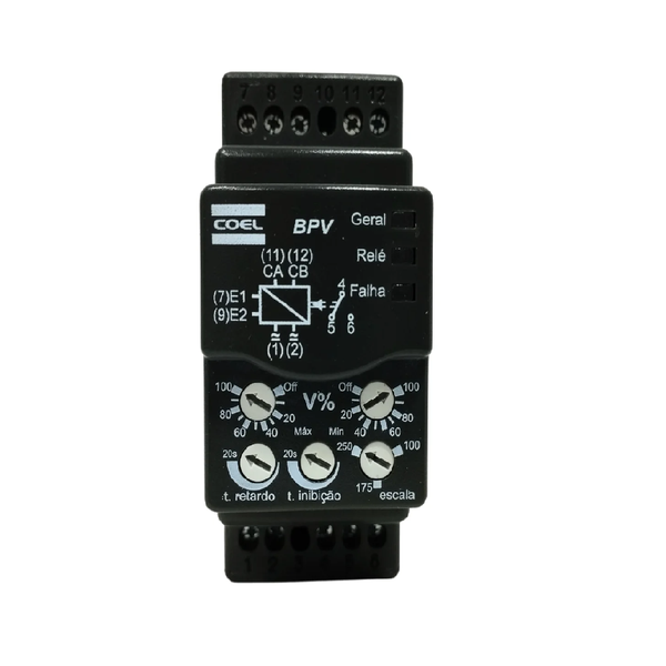 Este instrumento é indicado para redes monofásicas ou bifásicas. Possui um ajuste para determinar o valor da tensão mínima e outro ajuste para determinar o valor da tensão máxima medida na entrada E1-E2 (terminais 7 e 9) obedecendo assim uma faixa de funcionamento. É possível desativar a supervisão de tensão mínima ou máxima colocando somente o ajuste na posição “Desligado”. O monitor BPV também possui ajuste do tempo de inibição na partida (1 a 20 segundos) e ajuste do tempo de retardo no desligamento (1 a 20 segundos). O relé de saída funciona ligado ao funcionamento normal e desligado quando ocorre uma falha de tensão “mínima ou máxima”.